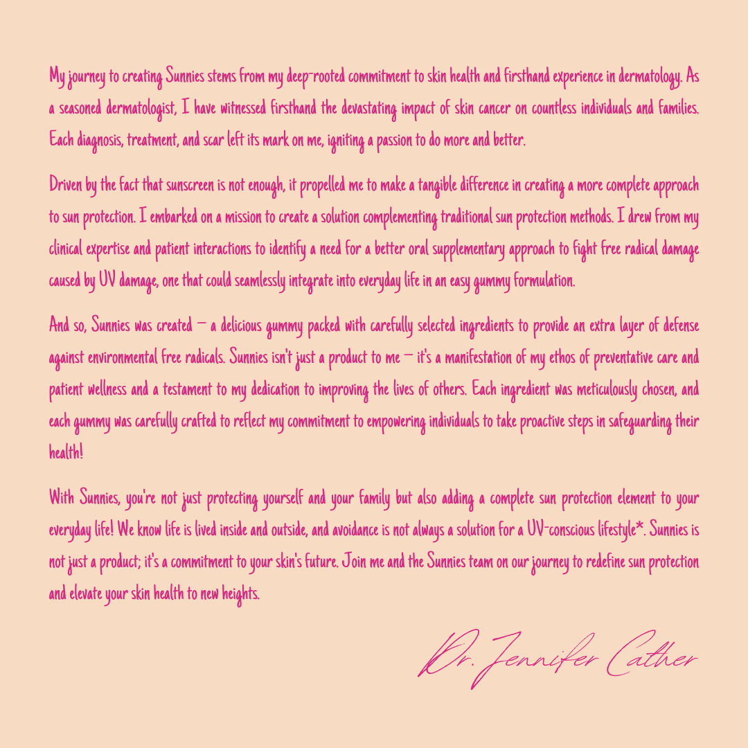 At Sunnies, we want to amplify sun safety by providing innovative solutions that create a more complete approach to sun protection. Our commitment extends far beyond creating photoprotective gummies – it's about empowering individuals to take proactive steps in protecting their skin from harmful environmental free radicals. Driven by a passion for prevention, wellness, and promoting healthy skin habits, we've crafted Sunnies to complement existing sun protection measures. We believe in the power of education and awareness in the fight against skin cancer with our Dermatologist & founder, Dr. Jennifer Cather! That's why we're dedicated to sharing knowledge and promoting sun-safe practices through our products and resources. From our inception, we've been guided by the ethos of preventative care, striving to make Sunnies accessible, effective, and enjoyable for all. With Sunnies, you're not just buying a product – you're joining a movement towards healthier, happier skin. Together, let's embrace the sunshine responsibly and enjoy the outdoors with confidence.